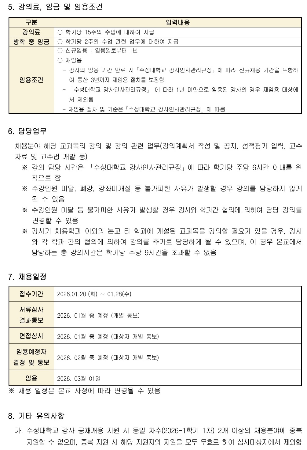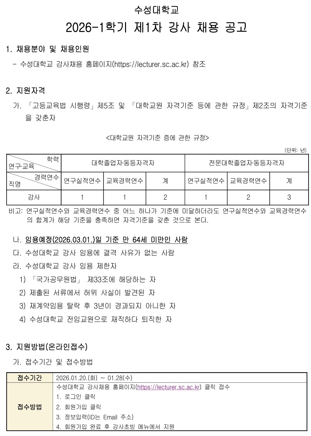 제목 2026-1학기 제1차 강사 채용 공고 작성자 교학지원팀 작성일 2026-01-20 첨부파일 1 2026-1학기 제1차 강사 채용 공고.pdf 강사채용 홈페이지 바로가기 https://lecturer.sc.ac.kr *강사 채용에 지원하시는 분들은 지원서 접수 후 해당학과에 접수 여부를 꼭 확인해주시기 바랍니다.*지원과정 중 로그아웃이 되거나 지원중 시스템 문제가 생길경우 053-749-7080으로 원격지원 요청해주시기 바랍니다. 목록