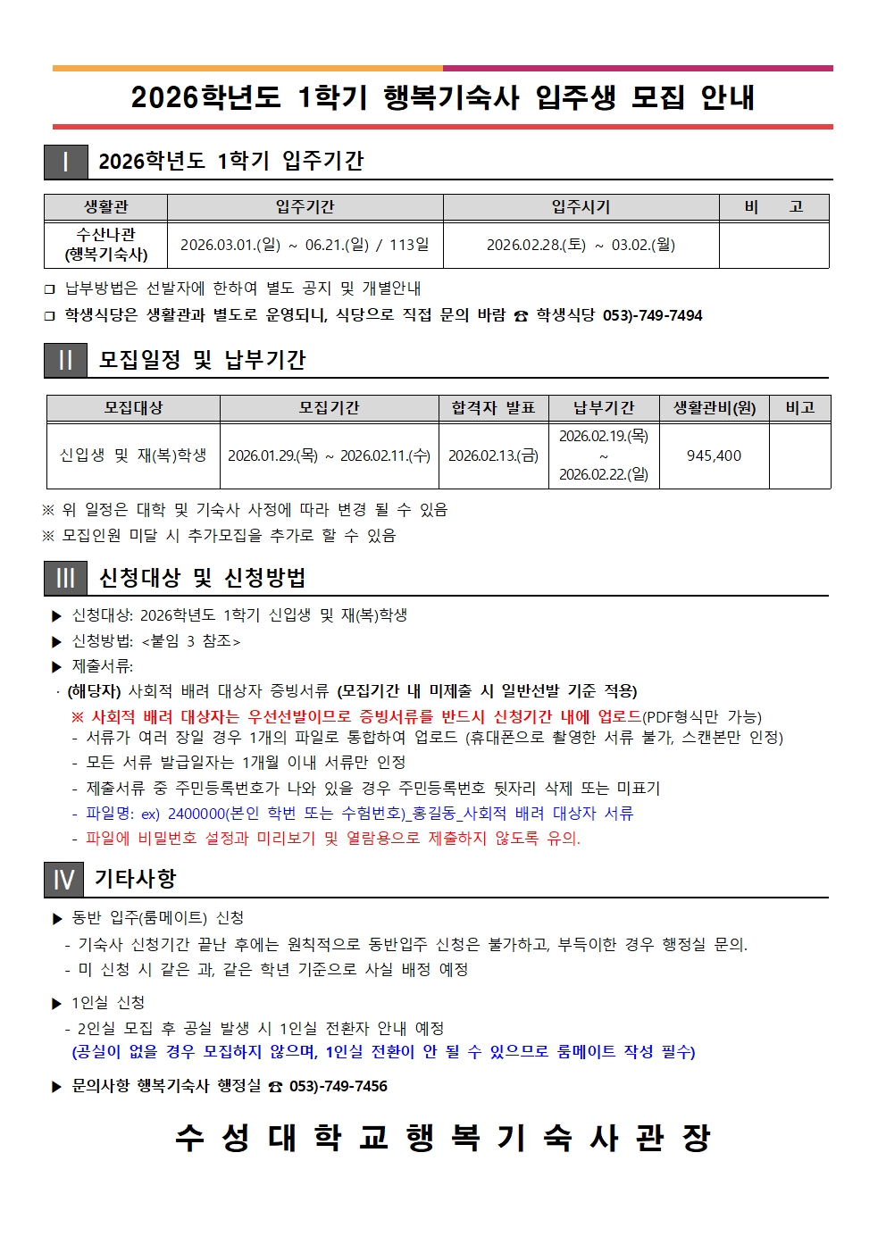 제목 2026학년도 1학기 행복기숙사 입주생 모집 안내 작성자 dorm 작성일 2026-01-27 첨부파일 1 붙임 1. 2026학년도 1학기 행복기숙사 입주생 모집 안내문.pdf 첨부파일 2 붙임 2. 행복기숙사 입주생 선발 기준 및 사회적 배려 대상자 기숙사비 지원 안내.pdf 첨부파일 3 붙임 3. 2026학년도 1학기 행복기숙사 입주 신청 방법.pdf 목록
