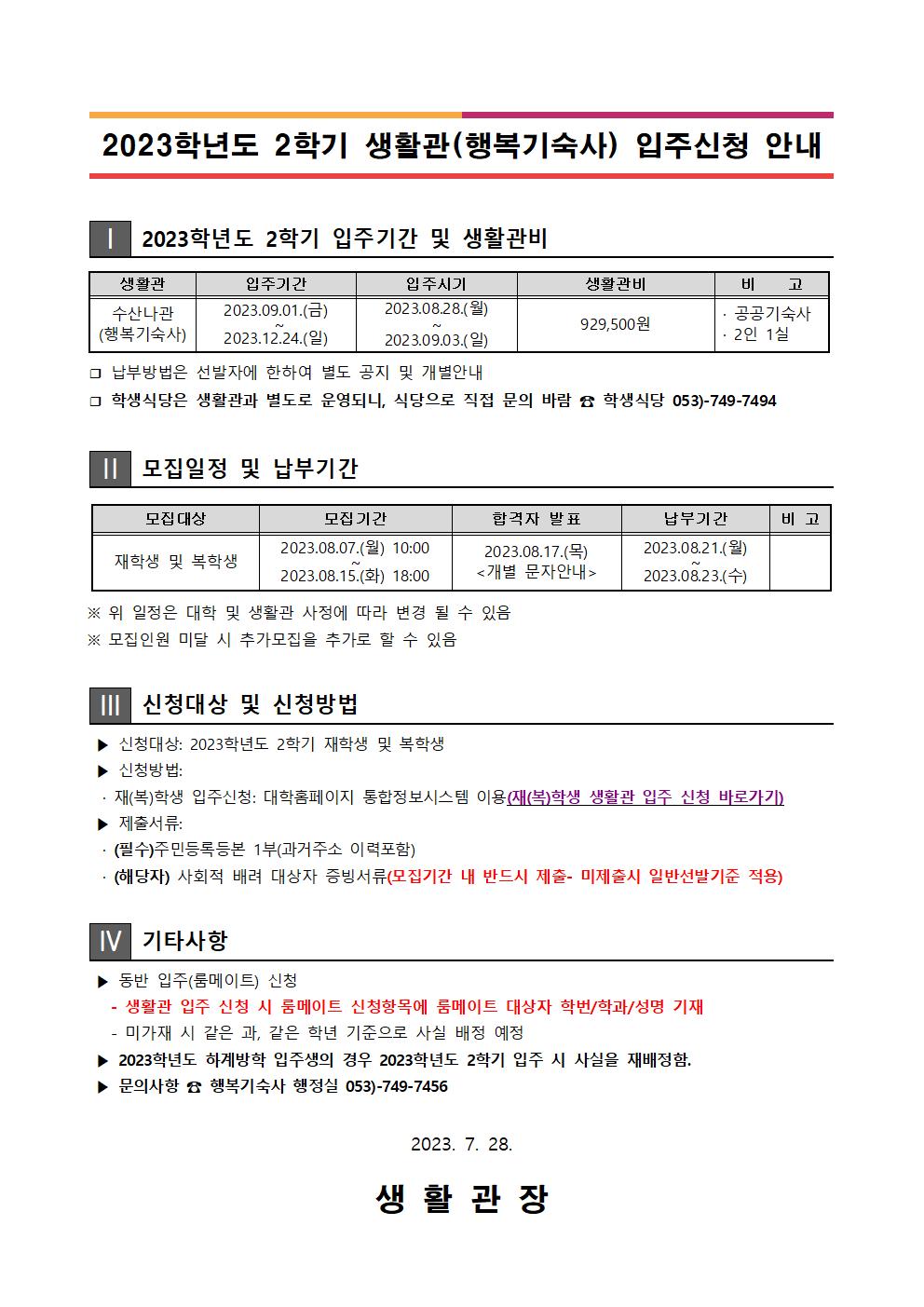 | 첨부파일 1 | 1.2023학년도 2학기 생활관(행복기숙사) 입주신청 안내문.hwp | ||