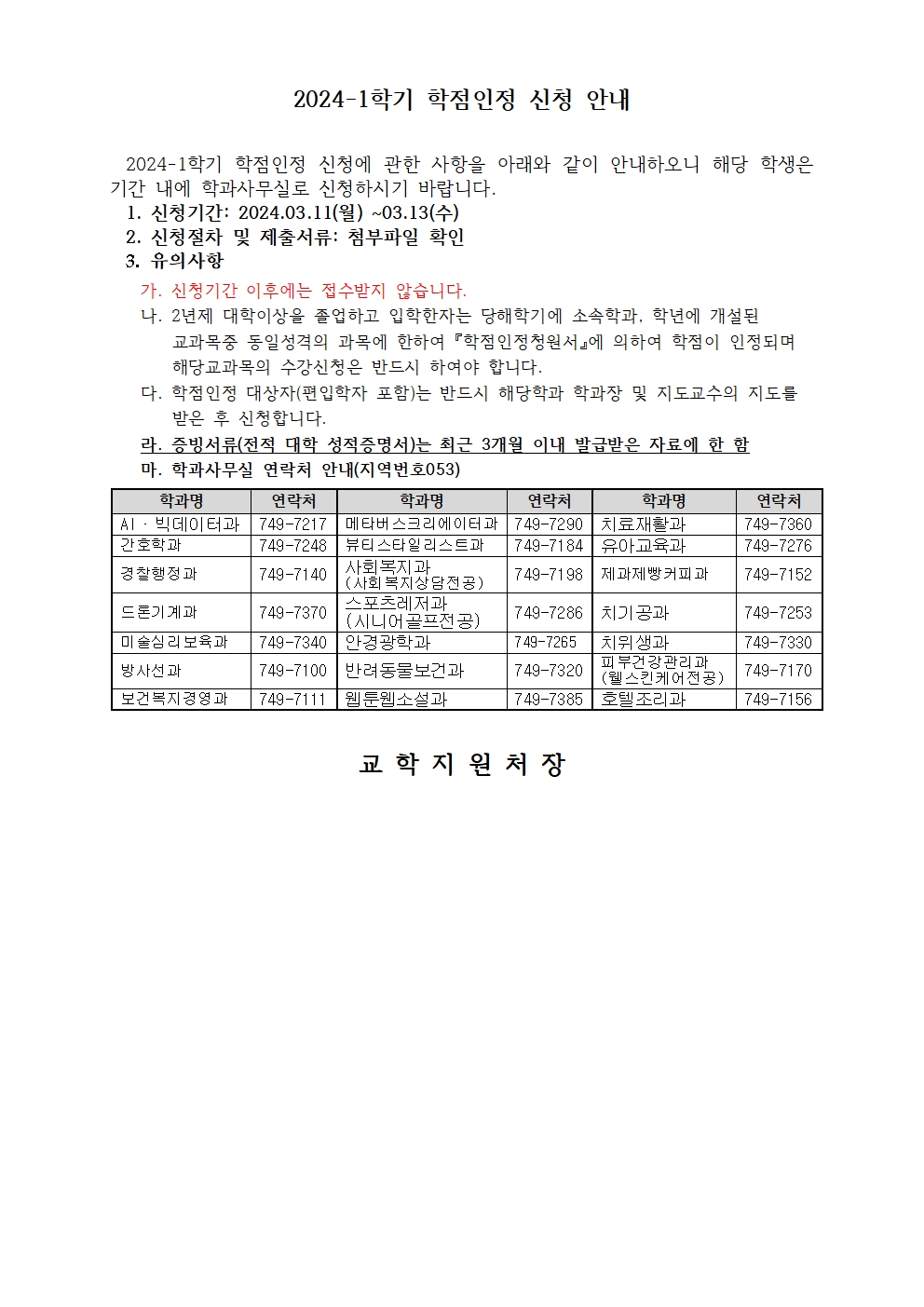 제목 2024-1학기 학점인정 신청 안내 작성자 교학지원팀 작성일 2024.02.28 첨부파일 1 붙임1 교학(학적) 2024-1학기 학점인정 신청 안내문.hwp 첨부파일 2 붙임2 학점인정청원서(2.3년제 이상 대학 졸업 및 수료자)서식.hwp 첨부파일 3 붙임3 학점인정신청서(편입생,군복무경험 등)서식.hwp 첨부파일 4 붙임4. K-MOOC강좌 학점인정 신청서 서식.hwp 목록