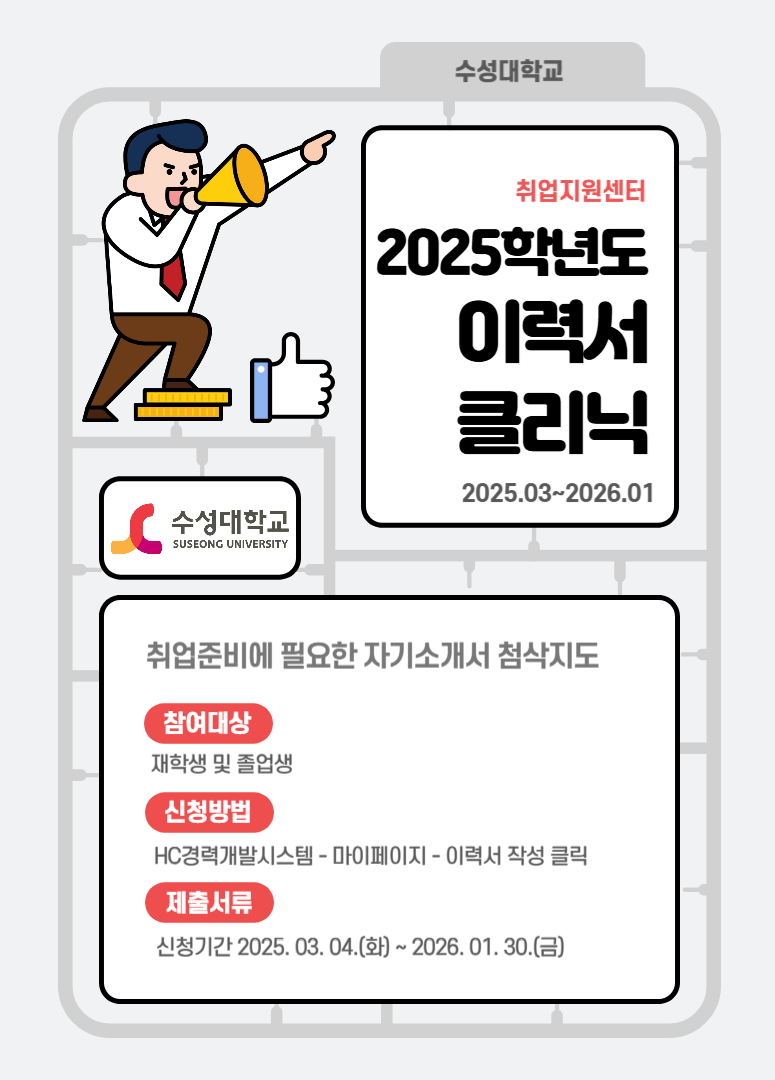 제목 [취업지원센터] 2025학년도 이력서(자기소개서) 클리닉 신청 안내 작성자 취업지원센터 작성일 2025.09.30 첨부파일 1 이력서클리닉 포스터.png 첨부파일 2 붙임_이력서+클리닉+신청방법 (4).pdf ※ 자세한 사항은 하단의 "이력서 클리닉 신청방법" 붙임 파일 참조 목록