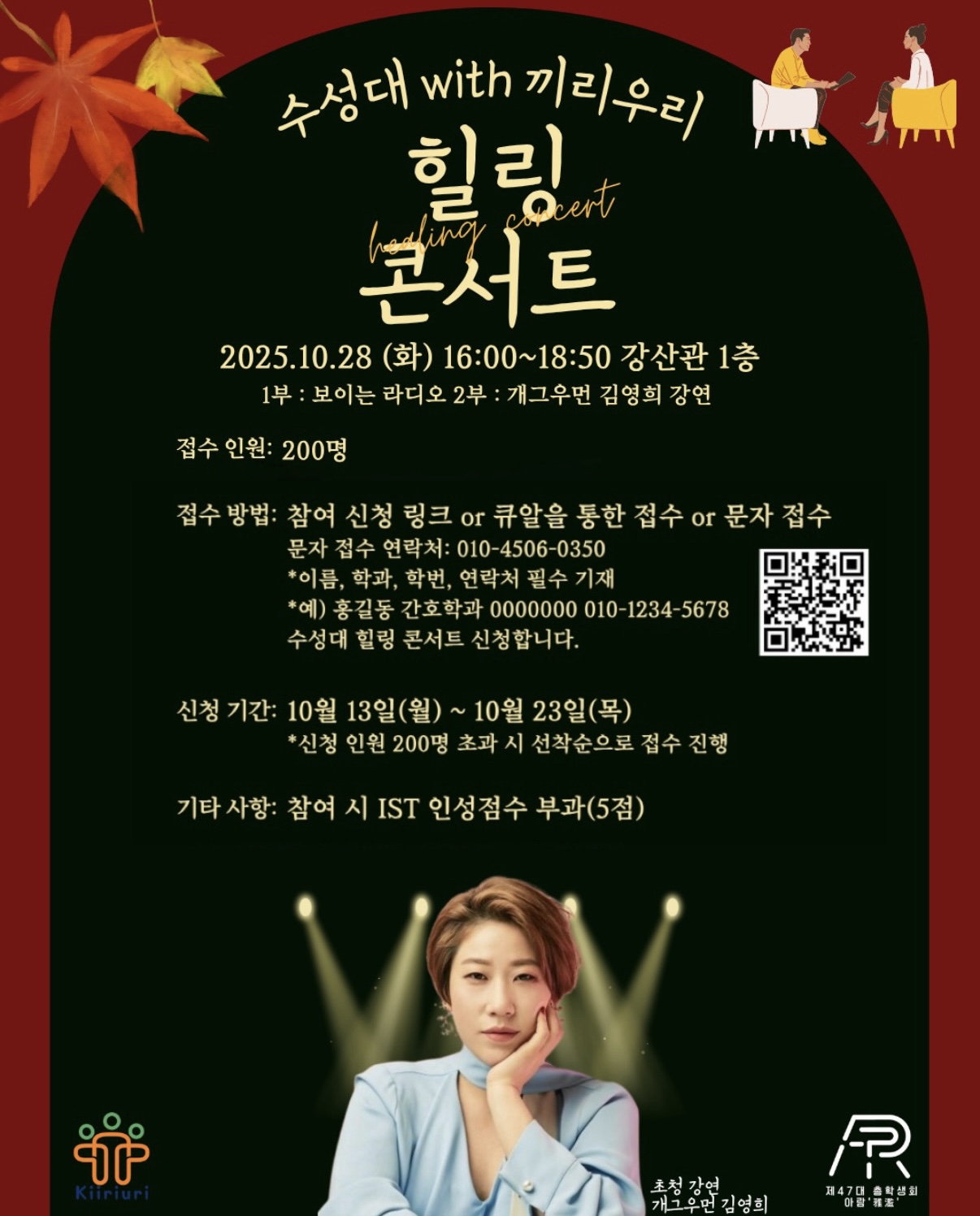 제목 [학생장학팀] 총학생회 아람 힐링 콘서트 개최 안내(with 끼리우리) 작성자 학생장학팀 작성일 2025.10.20 https://m.site.naver.com/1SJii 목록