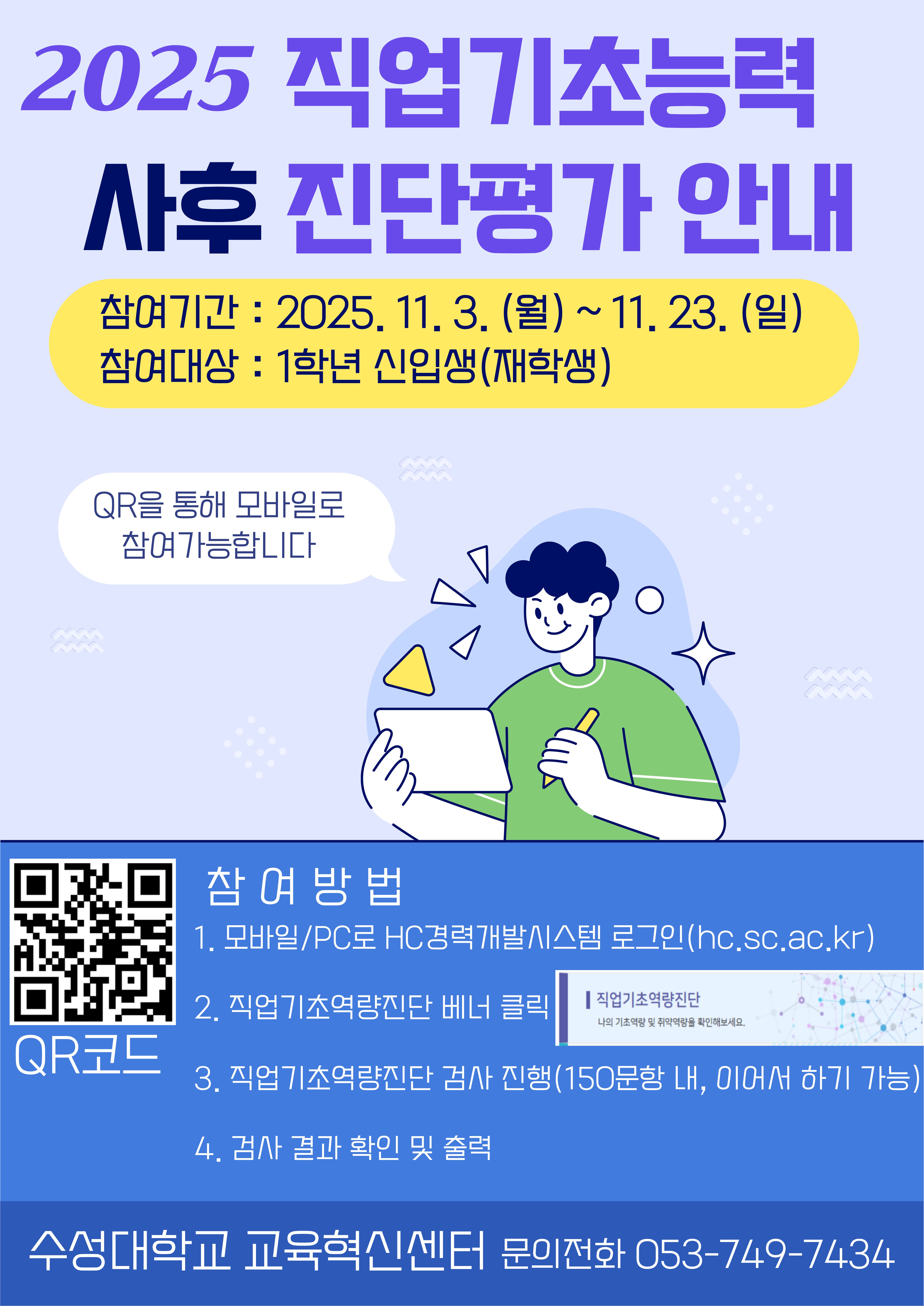 제목 [교육혁신센터]2025학년도 직업기초능력 사후 진단평가 실시 안내 작성자 교육혁신센터 작성일 2025.11.04 첨부파일 1 붙임 1.직업기초능력 진단평가 HC경력개발시스템 사용자 매뉴얼.pdf <2025학년도 직업기초능력 사후 진단평가 실시 안내> 가. 평가기간: 2025. 11. 03. (월) ~ 11. 23. (일)나. 평가대상: 2025학년도 1학년 신입생 전체다. 평가영역: 직업기초능력 10개 영역라. 평가방법: HC경력개발시스템-직업기초역량진단 - PC와 모바일 모두 참여 가능(붙임 1. 매뉴얼 참고) - HC경력개발시스템 링크: https://hc.sc.ac.kr/ 목록