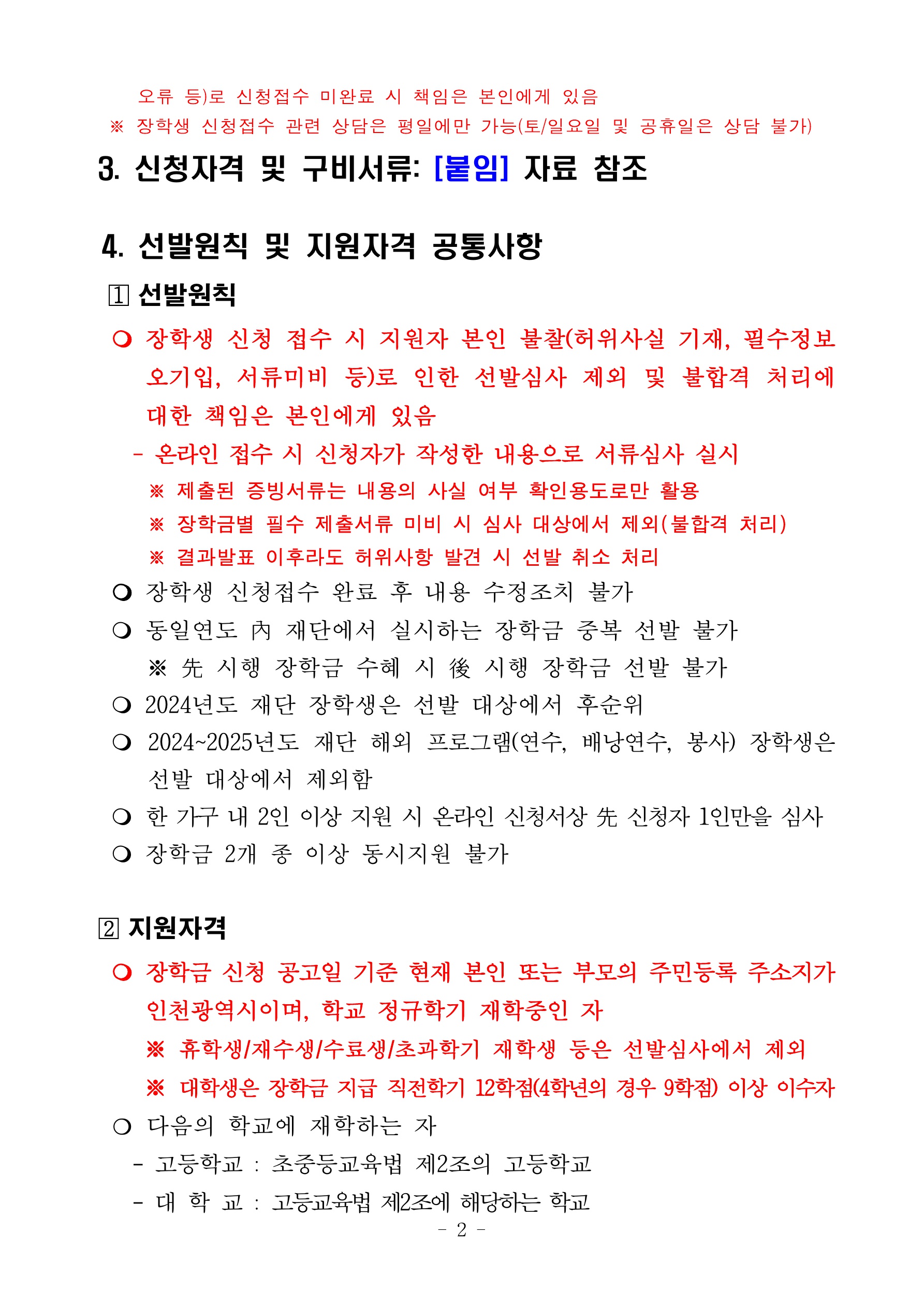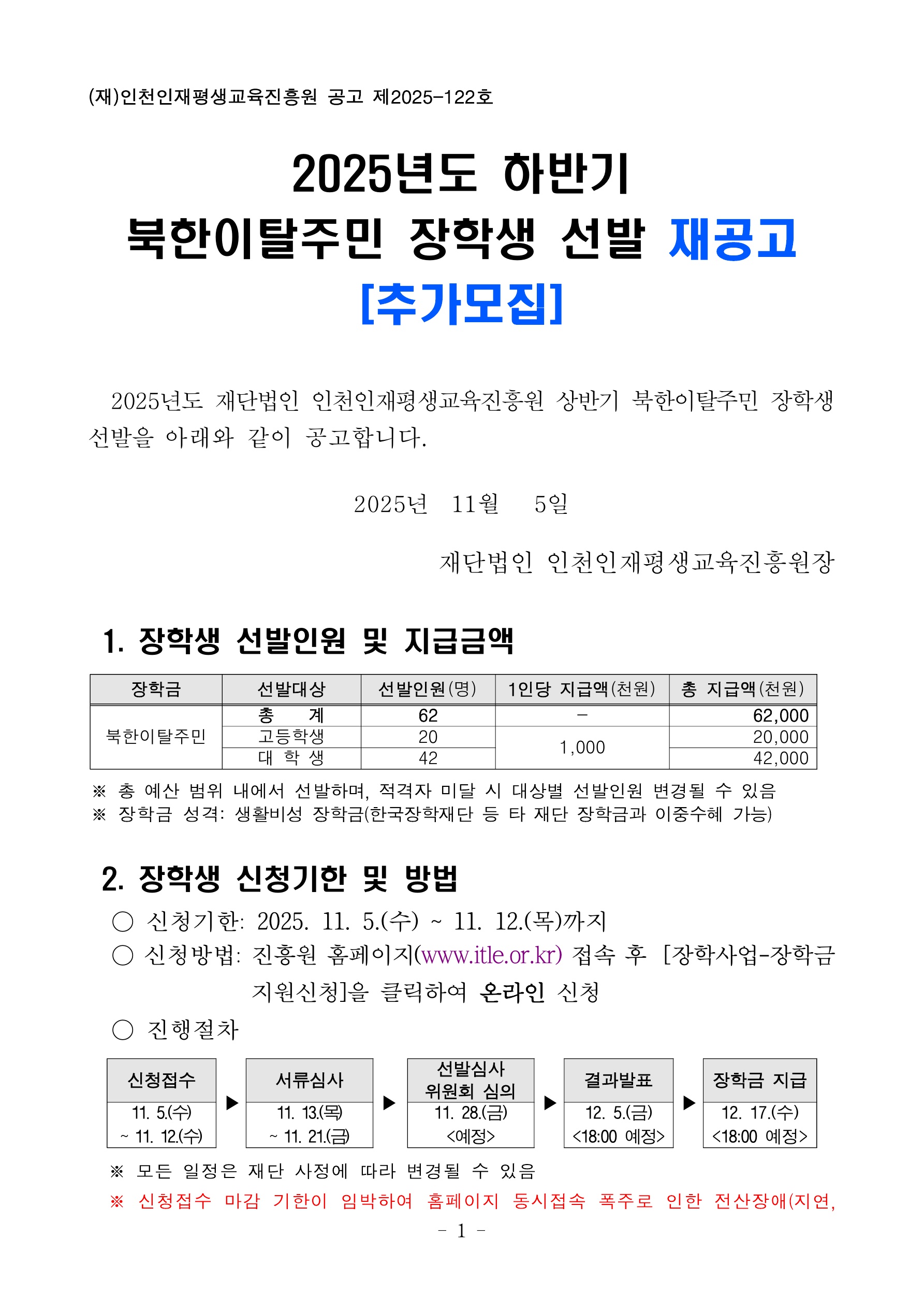 제목 [장학] 2025년도 하반기 「북한이탈주민 지원 장학생 선발」 추가모집 안내 작성자 학생장학팀 작성일 2025.11.07 (재)인천인재평생교육진흥원 장학생 선발 페이지: https://itle.or.kr/user/board/view.do?bbs_id=bbs_1&sq=14219 목록