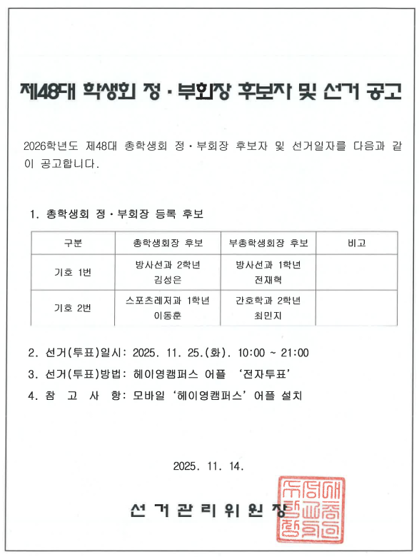 제목 제48대 학생회 정·부회장 후보자 및 선거 공고