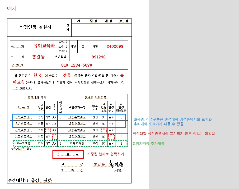 제목 [유아교육과] 2026-1학기 학점인정 신청 안내 작성자 유아교육과 작성일 2025.11.20 첨부파일 1 2026학년도 1학기 학점인정 신청 안내.pdf 첨부파일 2 학점인정청원서-8칸(2.3년제 이상 대학 졸업 및 수료자)서식.hwp 첨부파일 3 학점인정- 강의계획서 미제출 사유서.hwp 첨부파일 4 학점인정 청원서 작성예시.jpg <2026-1학기 학점인정 신청 안내>아래 첨부된 파일을 확인하시어 기한 내 제출바랍니다.▶ 제출 기간: 2025.11.24(월)~2025.12.31(금)▶ 제출 방법: 학과사무실에 원본 제출 목록