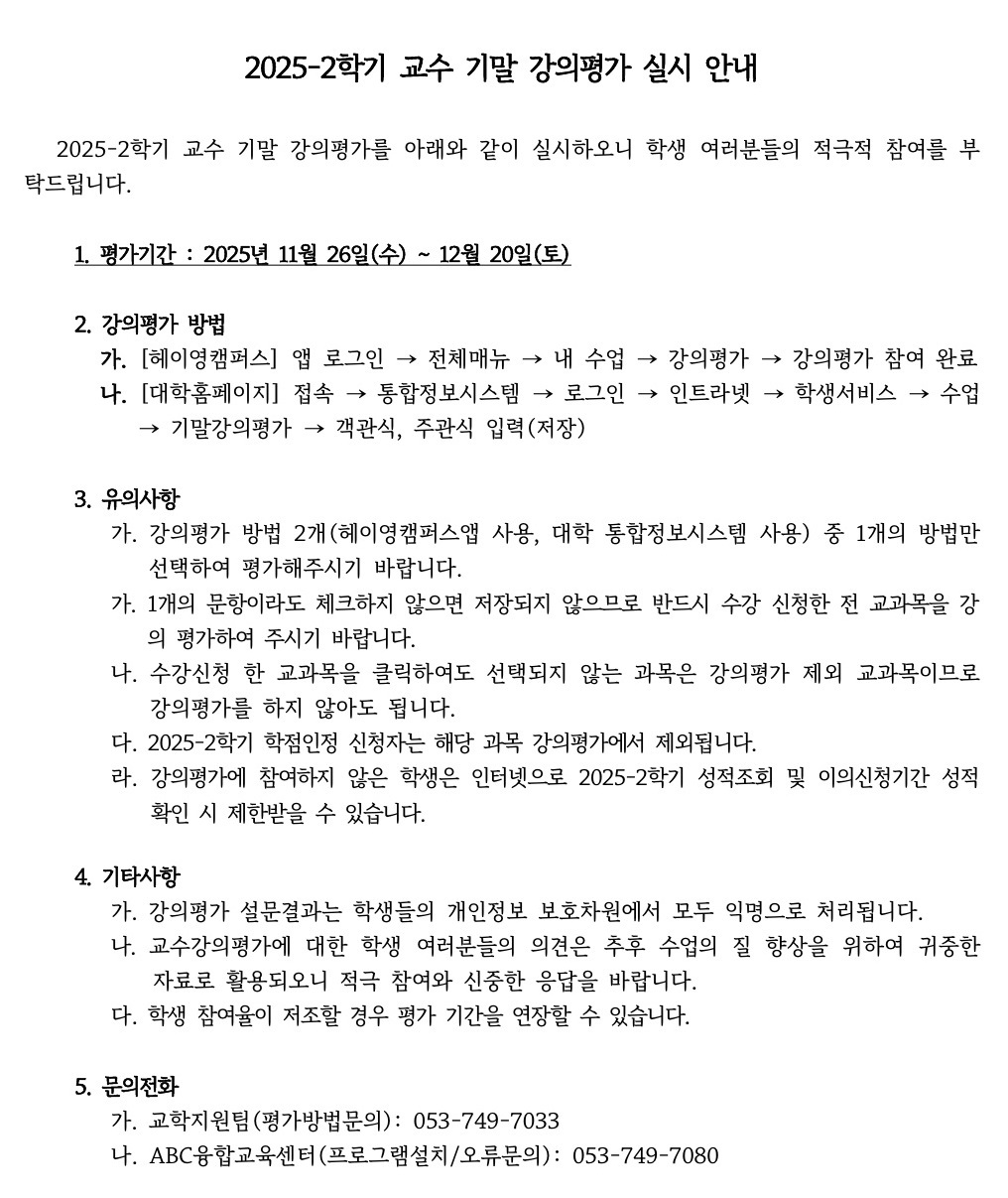 제목 2025-2학기 교수 기말 강의평가 실시 안내 작성자 교학지원팀 작성일 2025.11.27 첨부파일 1 붙임1. 헤이영캠퍼스 강의평가 매뉴얼.pdf 첨부파일 2 붙임2. 통합정보시스템 강의평가 매뉴얼.pdf 목록