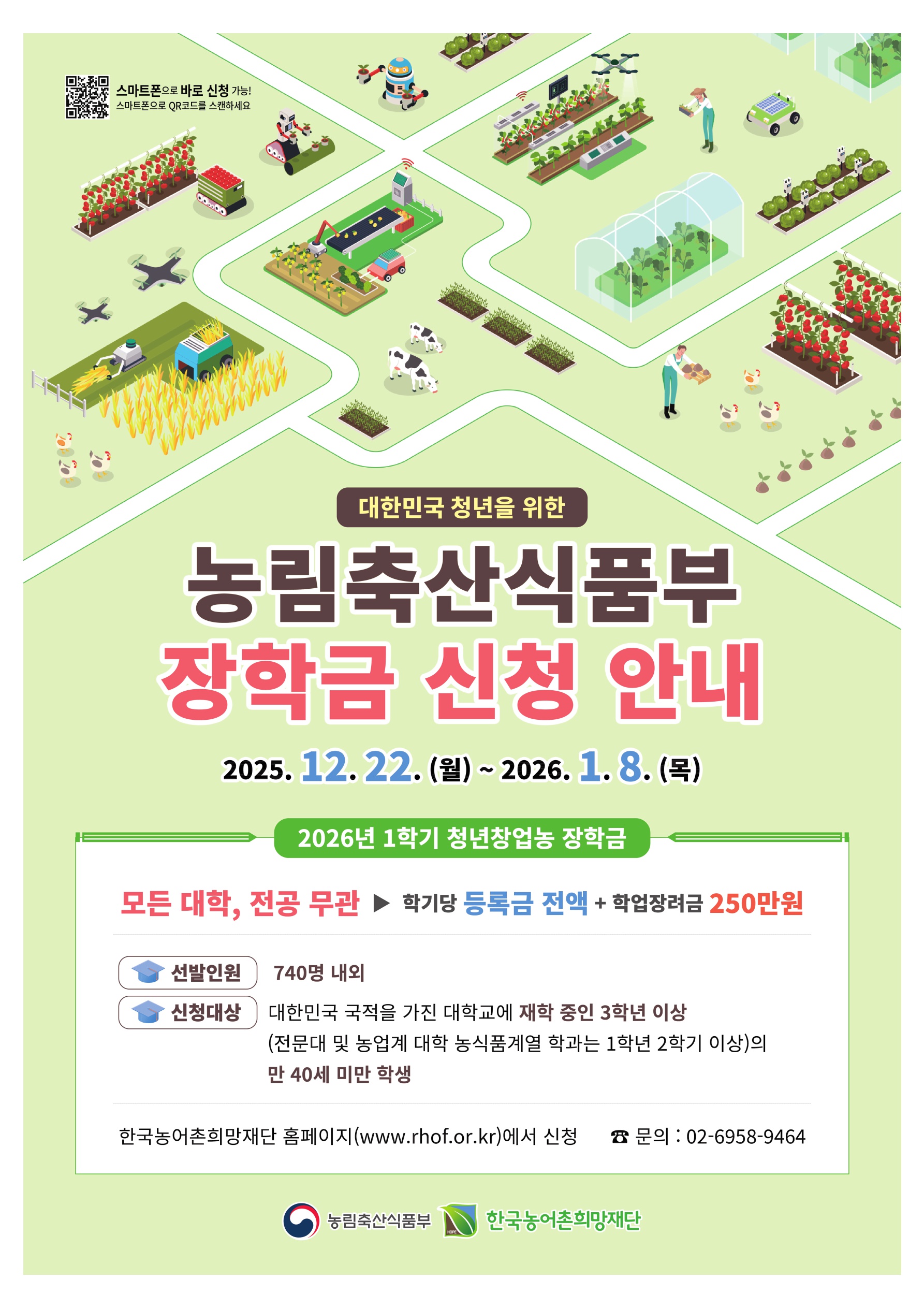 제목 [장학] 2026년 1학기 농림축산식품부 장학금 신청 안내 작성자 학생장학팀 작성일 2025.12.15 한국농어촌희망재단 홈페이지: https://www.rhof.or.kr/ 목록