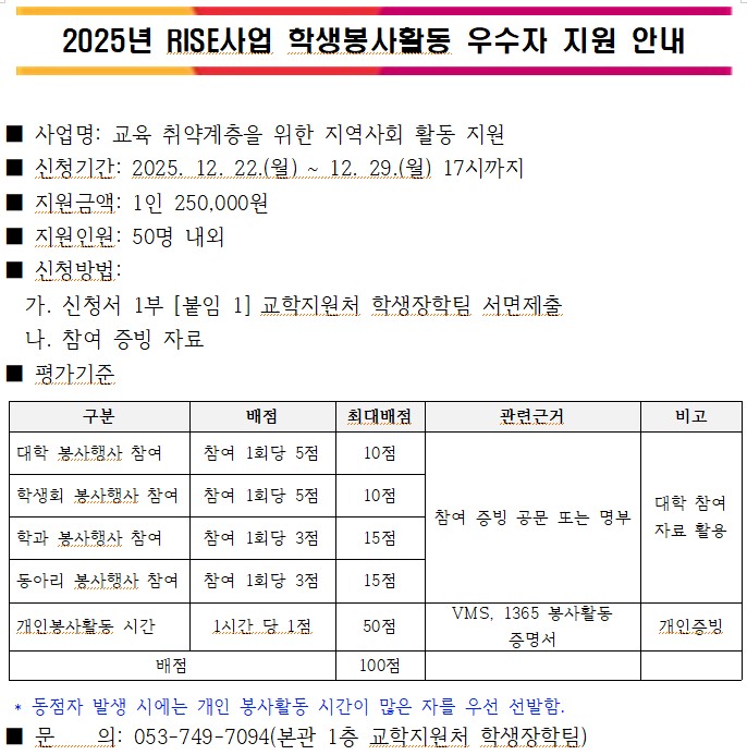제목 [학생장학팀] 2025년 RISE사업 학생봉사활동 우수자 지원 안내 작성자 학생장학팀 작성일 2025.12.22 첨부파일 1 붙임 2. 신청서 1부.hwp * 봉사시간 해당되는 기간: 2025. 03. ~ 현재까지 목록