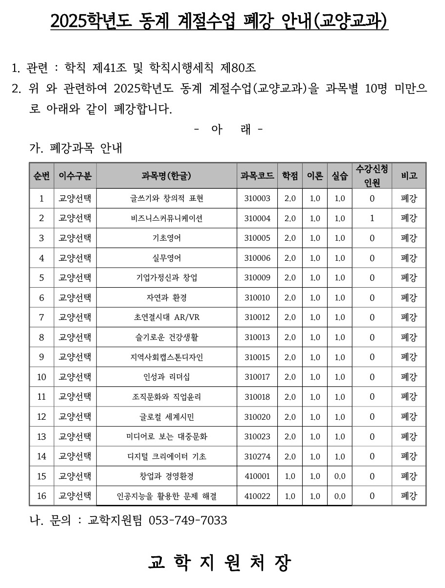 제목 2025학년도 동계 계절수업 폐강 안내(교양교과)