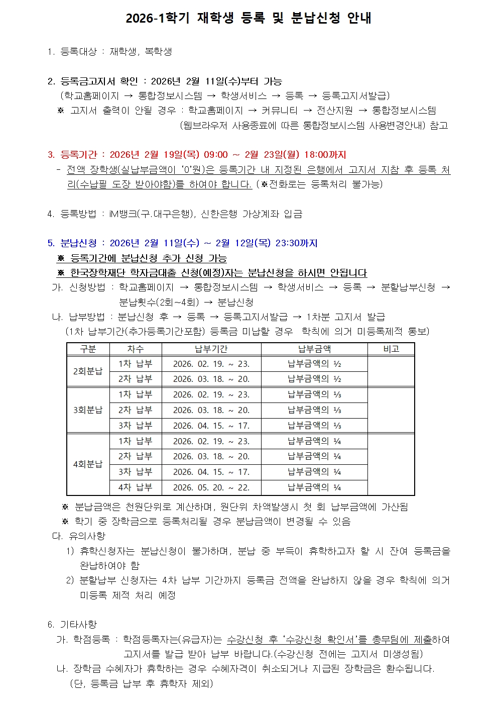 제목 [등록]2026학년도 1학기 재학생 등록금 분납신청 및 납부기간 안내