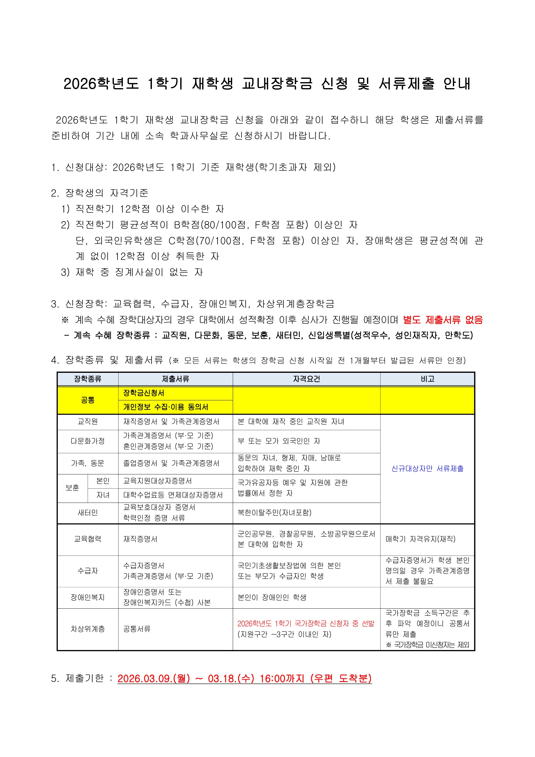 제목 [장학] 2026학년도 1학기 교내장학금 신청 및 서류제출 안내