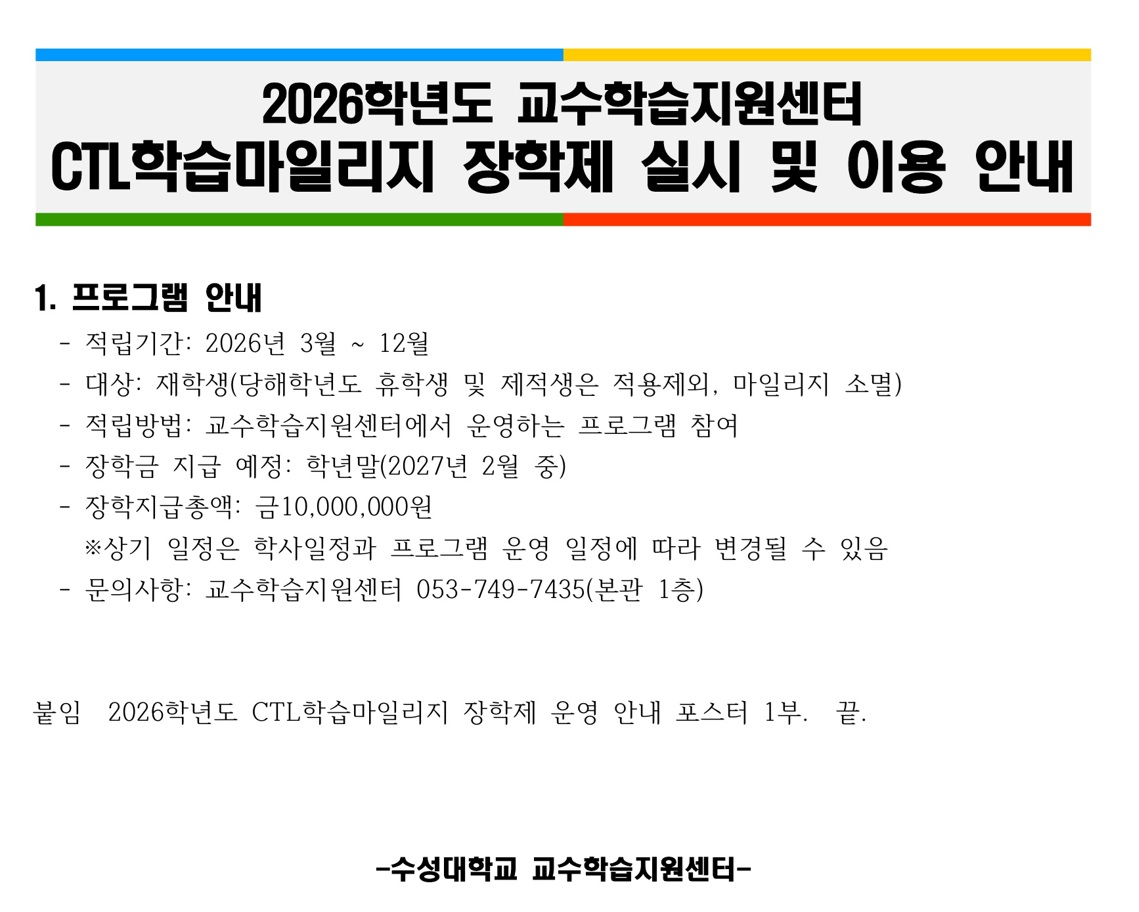 제목 [교수학습지원센터] 2026학년도 CTL학습마일리지 장학제 안내 작성자 교수학습지원센터 작성일 2026-03-11 첨부파일 1 (붙임) 2026학년도 CTL학습마일리지 장학제 홍보 포스터.pdf 목록