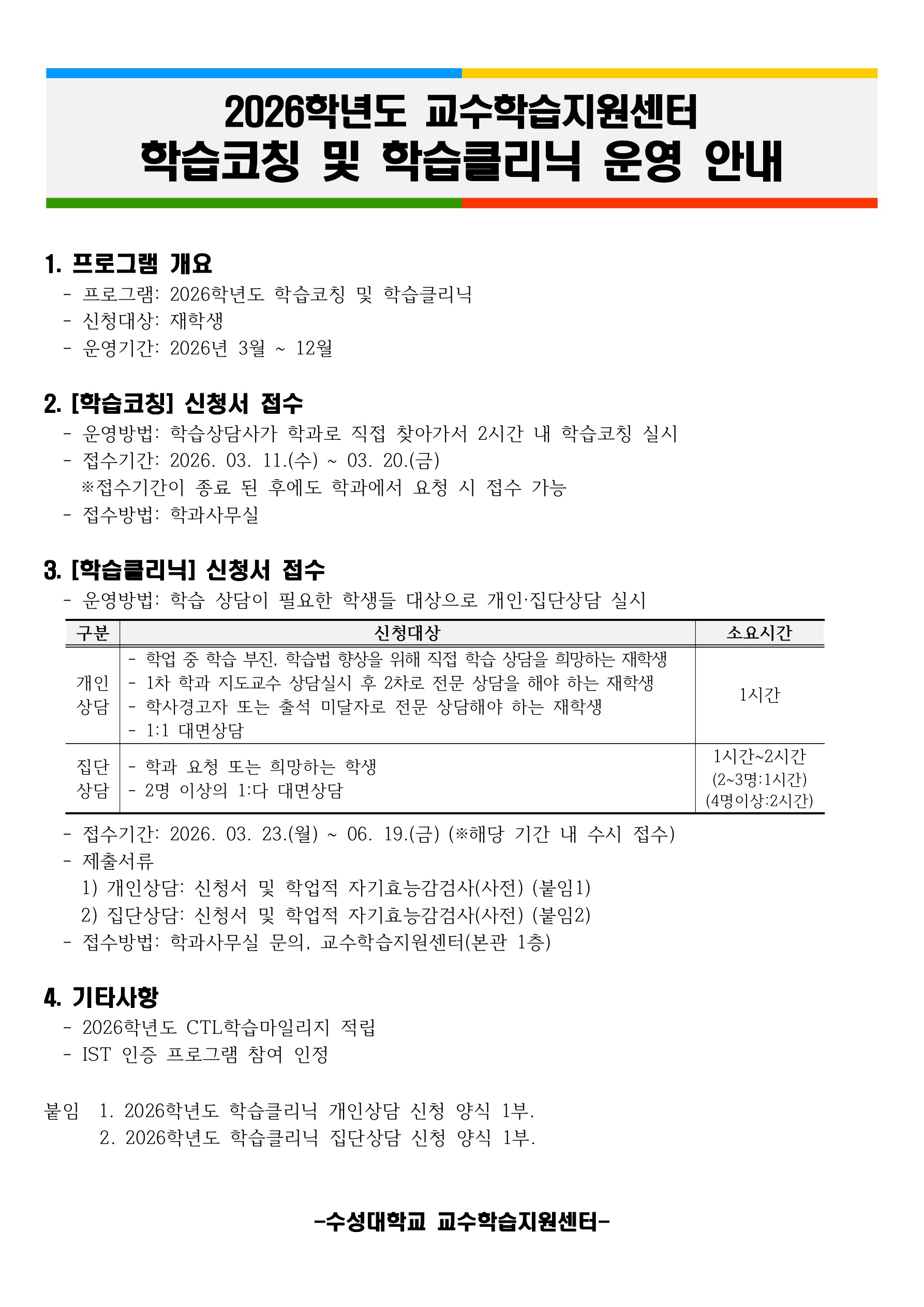 | 첨부파일 1 | (붙임1) 2026학년도 학습클리닉 개인상담 신청 양식.hwp | ||