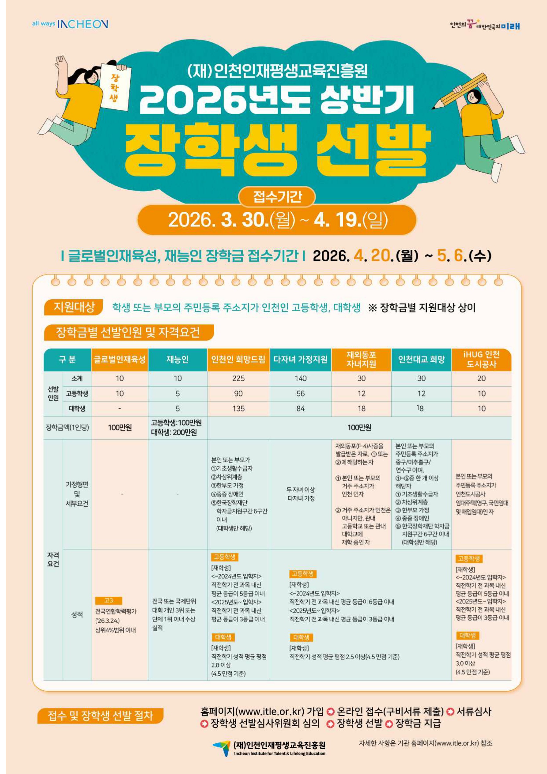 | 제목 | [장학] (재)인천인재평생교육진흥원 상반기 장학생 선발 안내 | ||