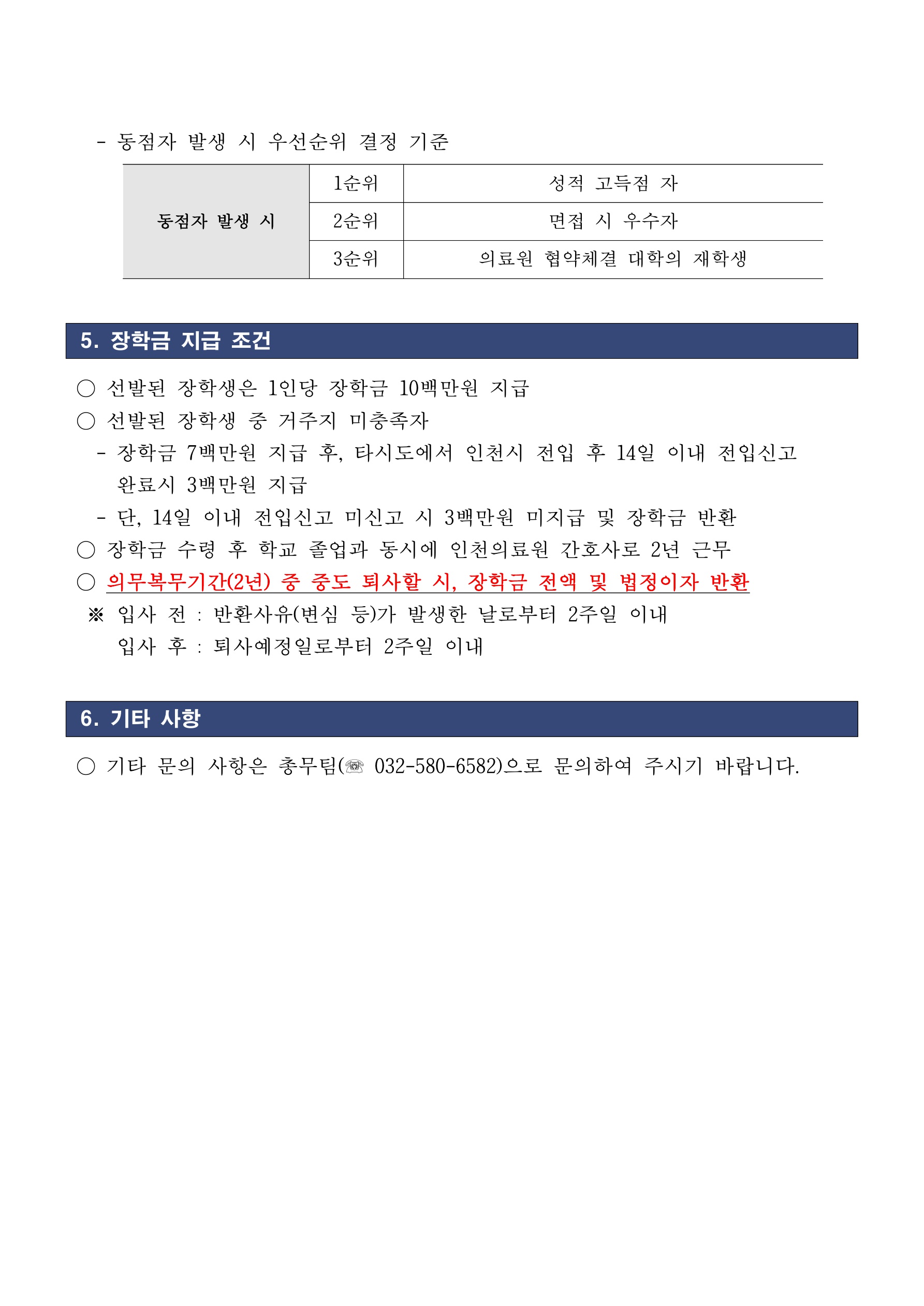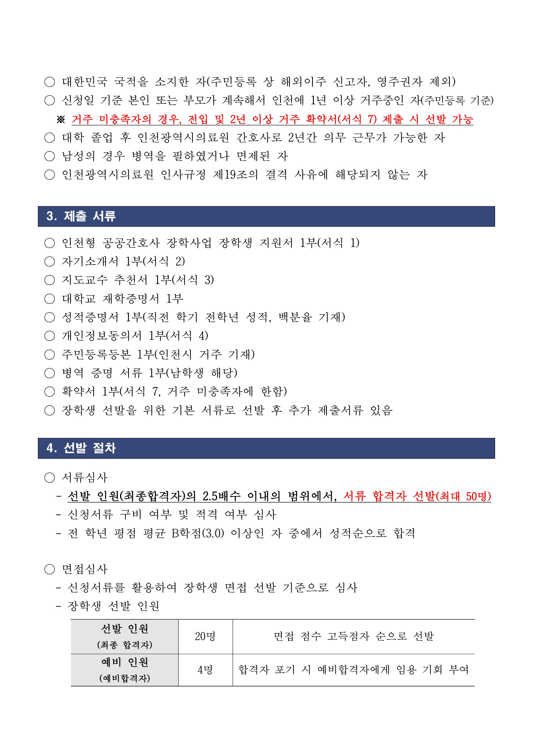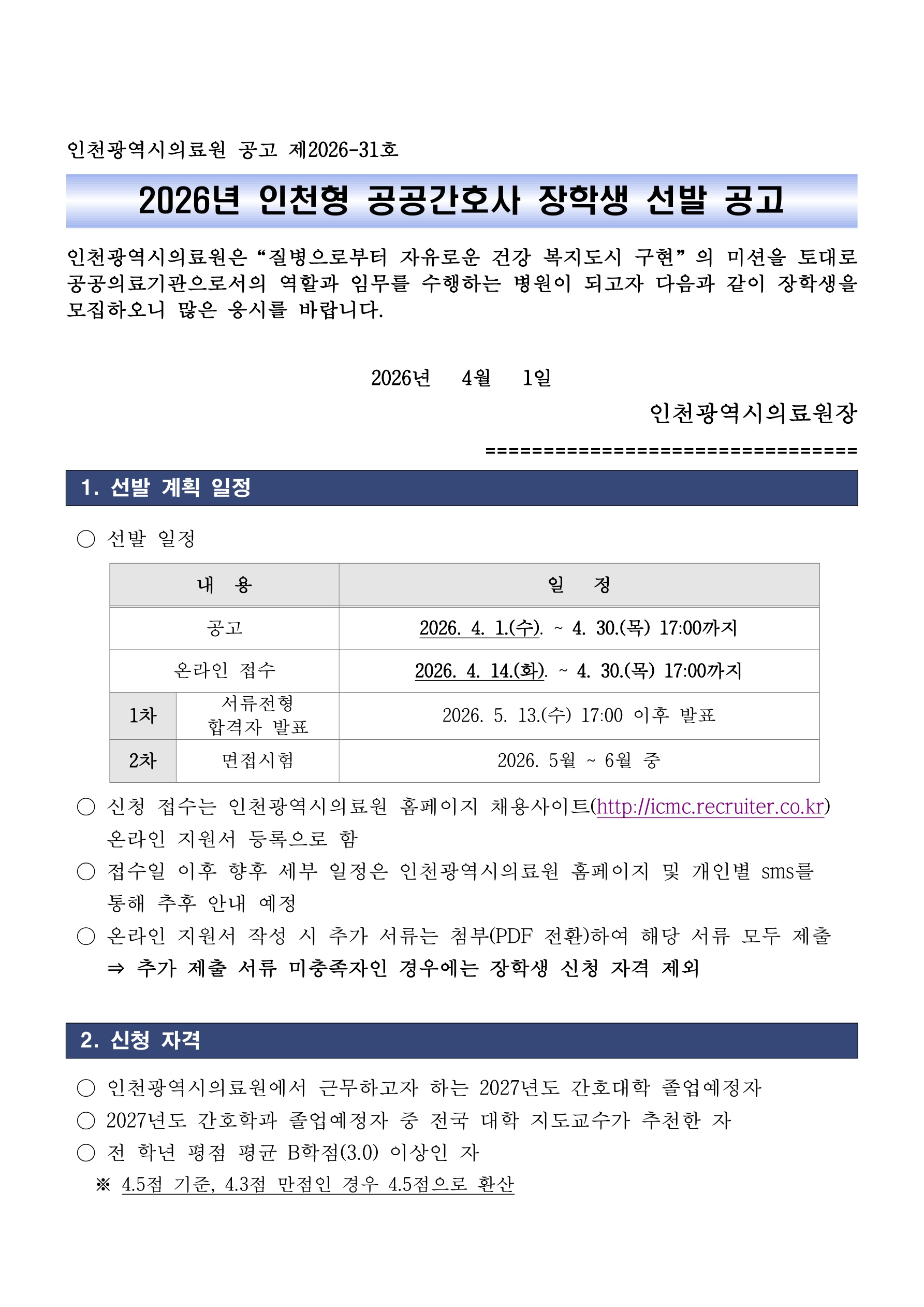 제목 [장학] 2026년 인천형 공공간호사 장학생 선발 공고 작성자 학생장학팀 작성일 2026-04-07 첨부파일 1 2026년 공공간호장학생 제출 서류 1부.hwp 장학생 선발 관련 링크: https://icmc.recruiter.co.kr/career/home 목록