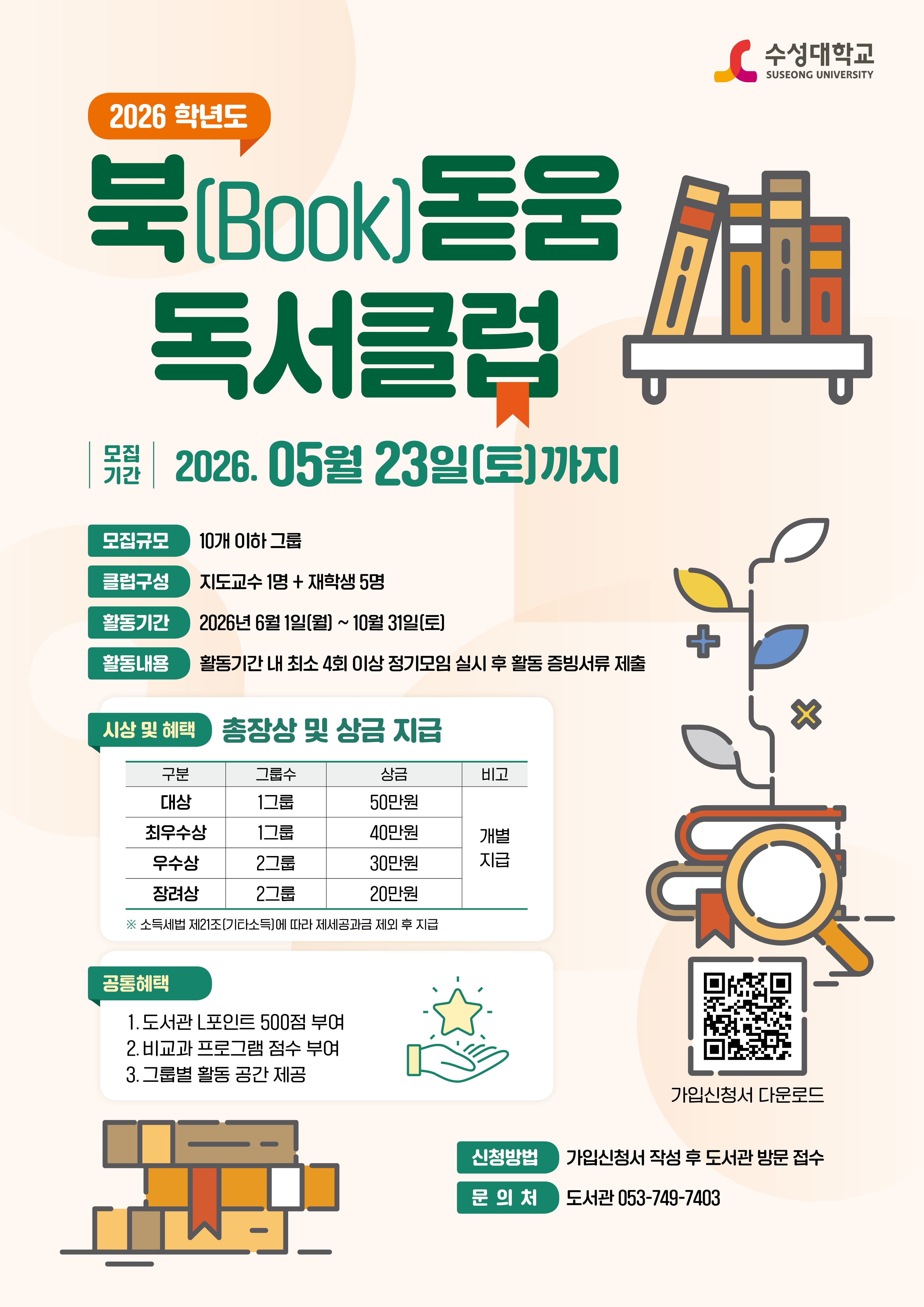 | 제목 | [도서관] 2026학년도 북(Book)돋움 독서클럽 모집 안내 | ||