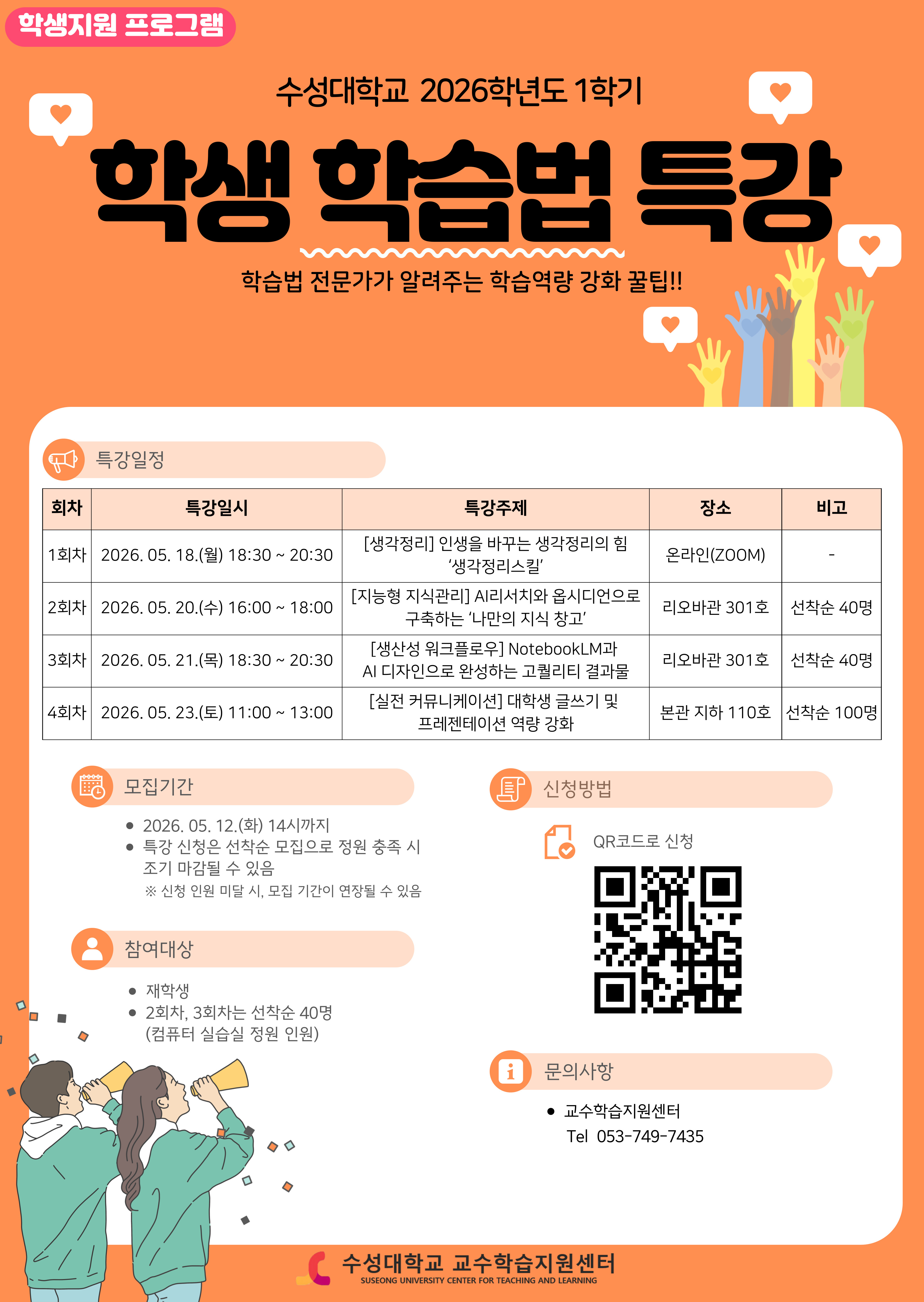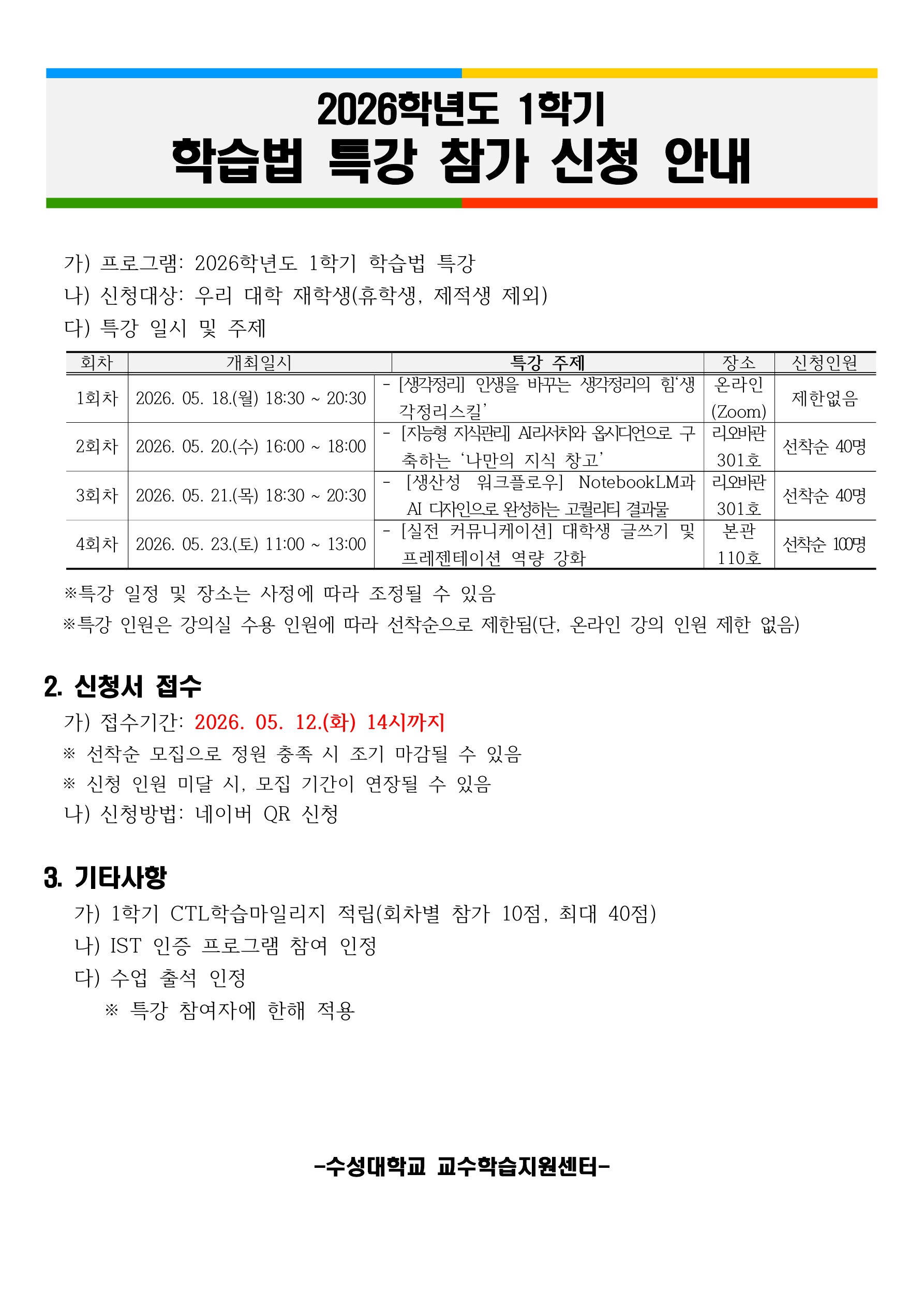 제목 [교수학습지원센터] 2026학년도 1학기 학습법 특강 운영 안내 작성자 교수학습지원센터 작성일 2026-04-29 첨부파일 1 (붙임1) 2026학년도 1학기 학습법 특강 운영 안내.pdf 목록