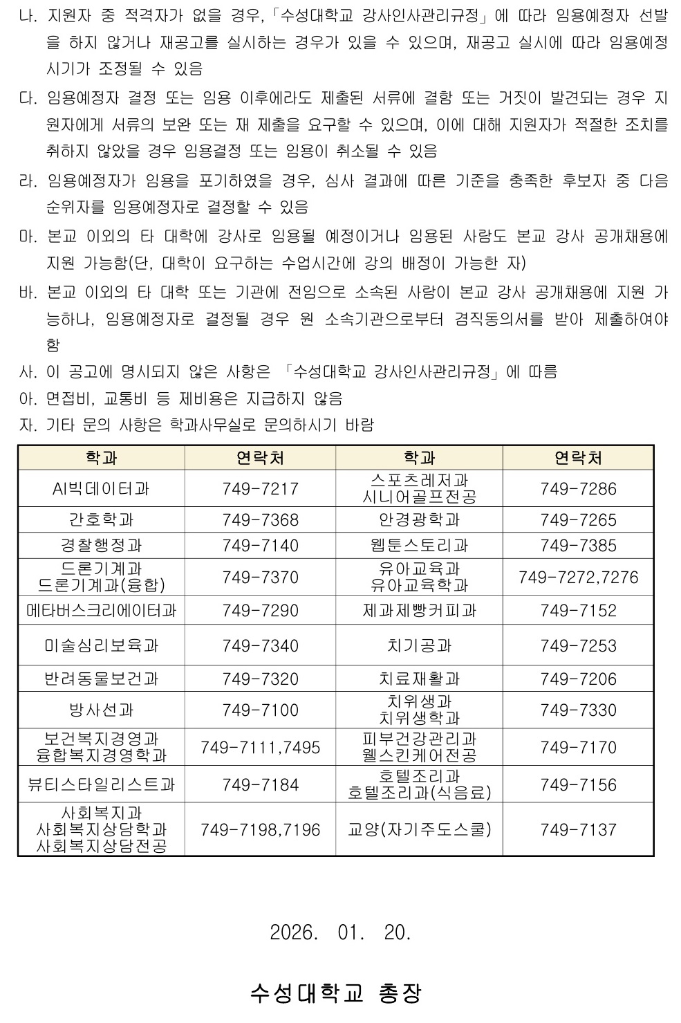 제목 2026-1학기 제1차 강사 채용 공고 작성자 교학지원팀 작성일 2026-01-19 첨부파일 1 2026-1학기 제1차 강사 채용 공고.pdf 강사채용 홈페이지 바로가기 https://lecturer.sc.ac.kr *강사 채용에 지원하시는 분들은 지원서 접수 후 해당학과에 접수 여부를 꼭 확인해주시기 바랍니다.*지원과정 중 로그아웃이 되거나 지원중 시스템 문제가 생길경우 053-749-7080으로 원격지원 요청해주시기 바랍니다. 목록