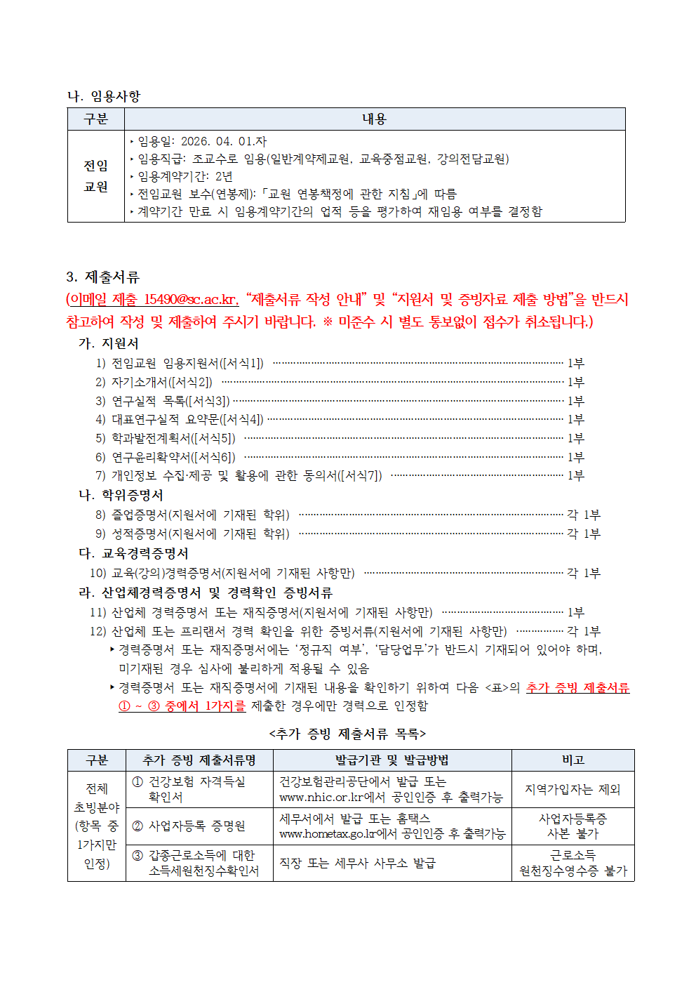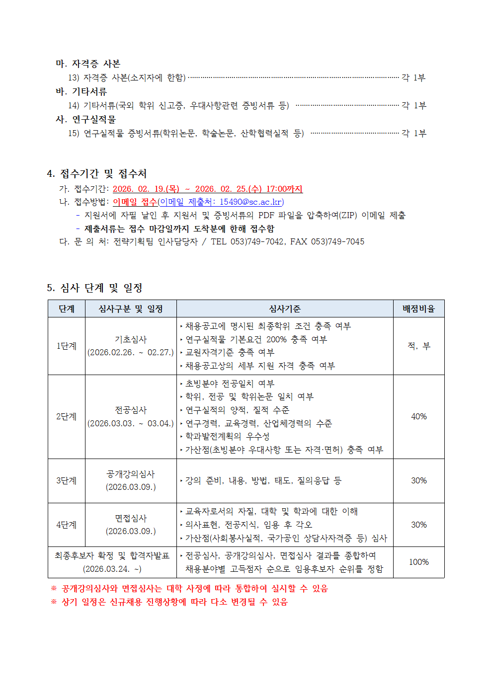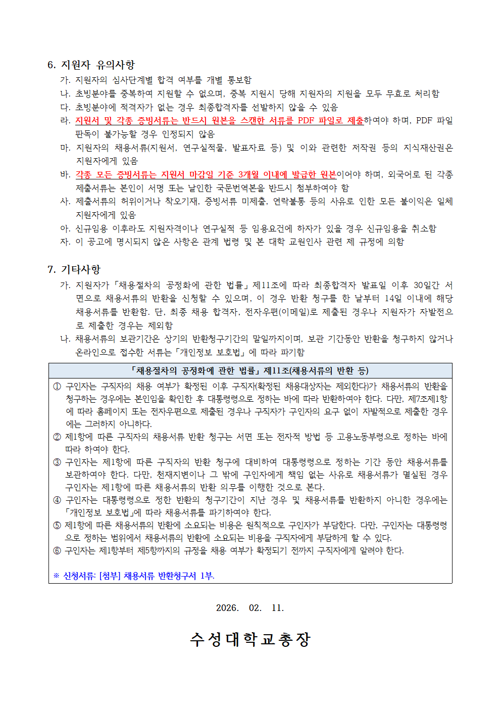 제목 수성대학교 2026학년도 1학기 제2차 전임교원 교수초빙 공고 작성자 전략기획팀 작성일 2026-02-11 첨부파일 1 붙임1_2026-1학기 제2차 전임교원 교수초빙 공고 및 서식.zip 목록
